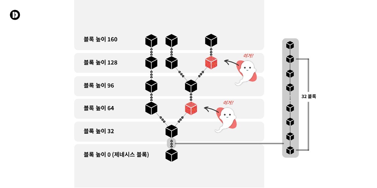 이더리움은 비트코인처럼 블록 단위로 정당한 체인을 선택하는 것이 아닌, 32개 블록의 간격을 갖는 체크포인트마다 정당한 체인을 선택하게 된다. 이에 대한 자세한 내용은 DSRV에서 정리한 https://www.coindeskkorea.com/news/articleView.html?idxno=80258 포스트를 참고하는 것이 좋겠다.