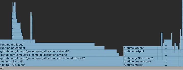 위 예시 세 가지의 메서드에 대한 벤치마크를 한 결과다. 관련된 변수의 메모리 요구 사항이 거의 동일함에도 불구하고 BenchmarkStackIt2의 상대적인 CPU 오버헤드가 두드러진다. stackIt과 stackIt2 구현의 CPU 프로파일에 대한 플레임 그래프를 생성하면 좀 더 많은 인사이트를 얻을 수 있다.