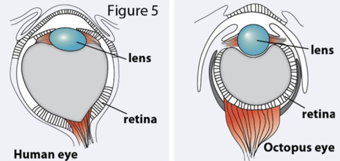 이번에는 사람의 눈과 문어의 눈의 구조를 보자. 둘 다 렌즈(수정체)와 망막을 가지고 있는 '카메라 눈'의 구조를 갖고 있다. 사람과 문어가 공통 조상으로부터 눈을 직접적으로 물려받지는 않았을 것이다.